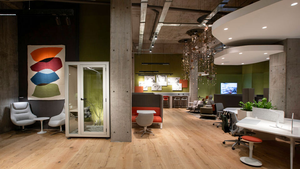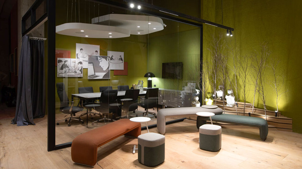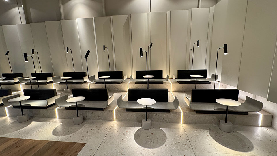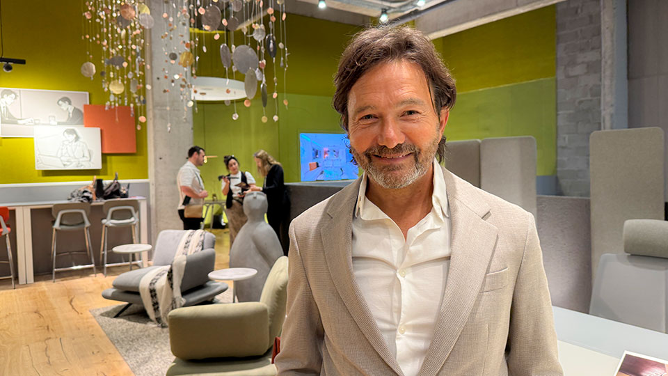 Daniel Cwirenbaum (▴ foto), de Grupo A2 Archivos Activos, describe su propuesta: “Hicimos un coworking, un espacio que une la parte de trabajo, de auditorio, parte de reunión y socialización. Sillones giratorios, bar y barra para trabajo. Una sala de reuniones. Toda la fabricación es nuestra, industria argentina”.