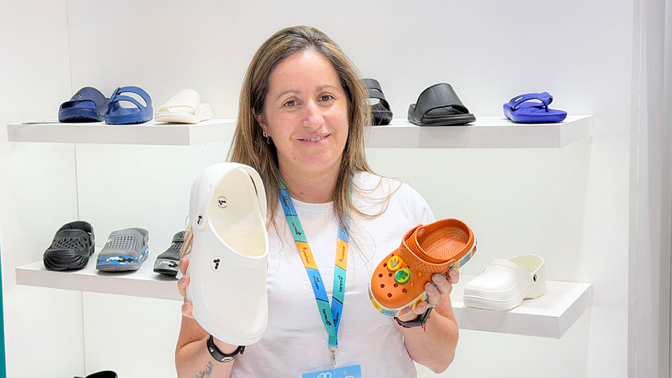 Andrea Rodríguez (▴ foto), comercial mayorista de la firma Arena, presenta la propuesta de la empresa que participó con un stand de cuatro lotes: “Tenemos un producto muy importante en sanidad, se llama el Sueco Ginebra, para profesionales de hospitales, gastronomía, hotelería. Se suma el antideslizante, es un producto ergonómico y económico para lo que es uniforme. Viene del talle 35 al 45. Industria 100% nacional”.