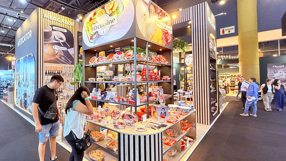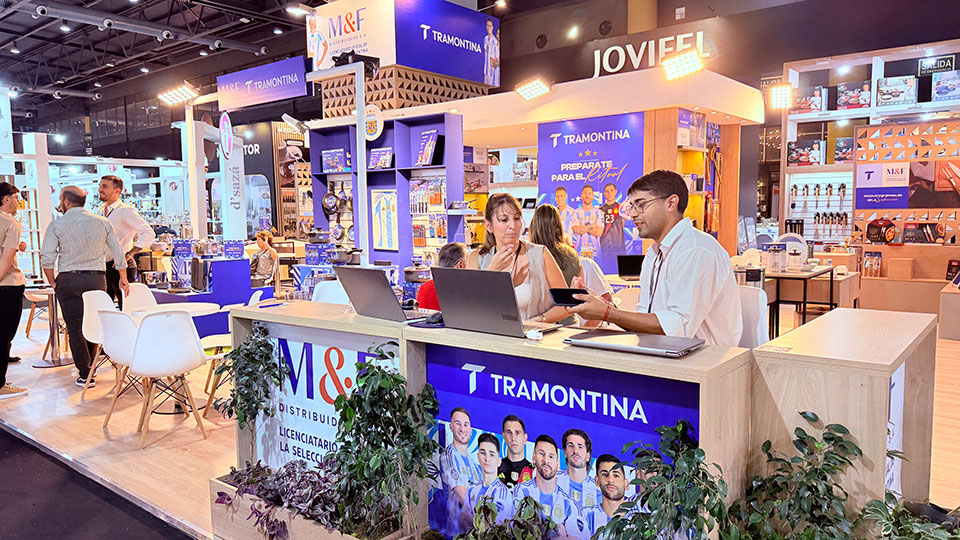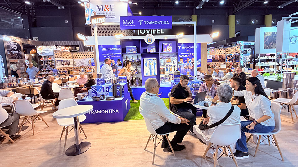 El gerente comercial explicó que con los cambios en la regulación de importaciones se acabaron los problemas de abastecimiento: “Vamos a tener el mayor surtido posible con stock permanente acá en Argentina de nuestras dos marcas y aparte siempre traemos lanzamientos y productos nuevos. O sea, la idea es renovarle al cliente el portfolio de productos. Eso es clave”. Sobre la calidad, destacó: “En Tramontina la calidad es excelente”. El stand fue diseñado y construido por el estudio Global Arquitectura más Experiencias.