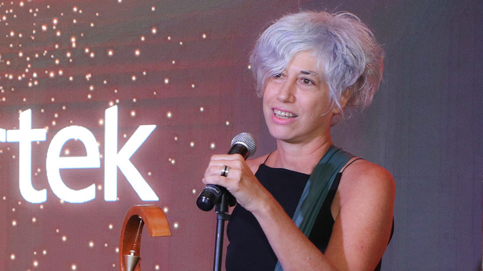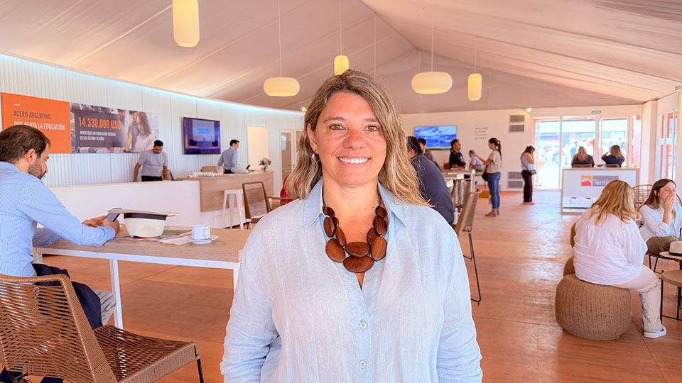 “Todo el interior está realizado y revestido con productos del cliente: acero, chapas blancas acanaladas en toda la pared, la gráfica institucional en el área del auditorio, la carpintería metálica exterior, las mallas, las estructuras de hierro, las columnas. Todo tuvo esa presencia institucional”, destacó Gabriela Pacífico (▴ foto), responsable de la coordinación técnica del stand por parte de Artek.