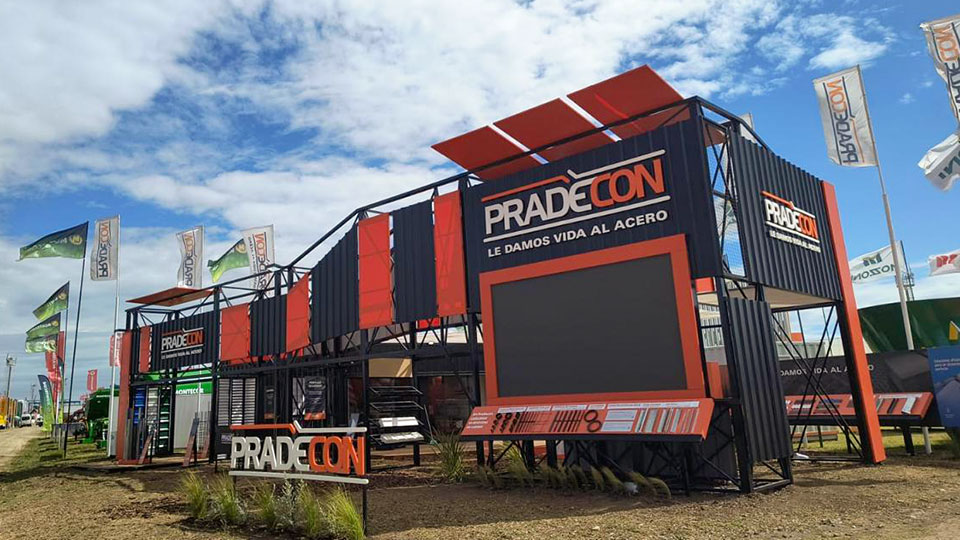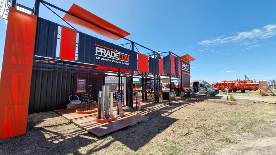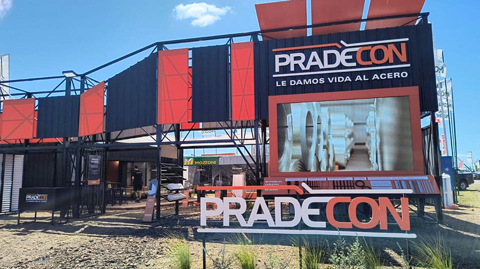El stand de Pradecon se destacó por su imponente estructura metálica de dos niveles que materializó el claim corporativo “Le damos vida al acero”. Con una arquitectura industrial de gran escala, el pabellón combinó robustez constructiva, identidad visual potente y tecnología audiovisual.