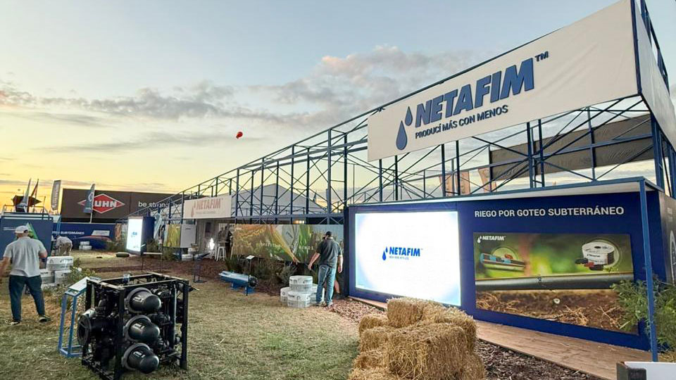 En la esquina de mayor exposición del lote —punto neurálgico de circulación dentro del predio— se dispuso un espacio específico para charlas técnicas y demostraciones en vivo. Pensado como un foco de atracción que convocara al público, este sector potenció la interacción directa con la marca y permitió que los técnicos de Netafim explicaran el funcionamiento de los sistemas de riego por goteo frente a productores, agrónomos e ingenieros.