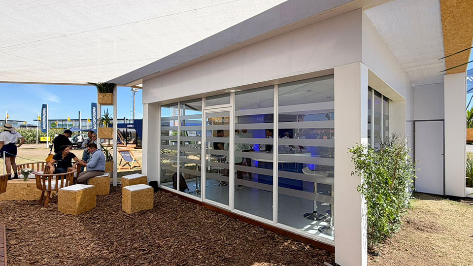 Se utilizaron estructuras livianas, panelería blanca y decks de madera para crear un ambiente cálido y vinculado al paisaje productivo. “El objetivo fue crear un espacio que funcione como punto de encuentro y herramienta de posicionamiento estratégico para Shell Agro”, agregaron desde el estudio.