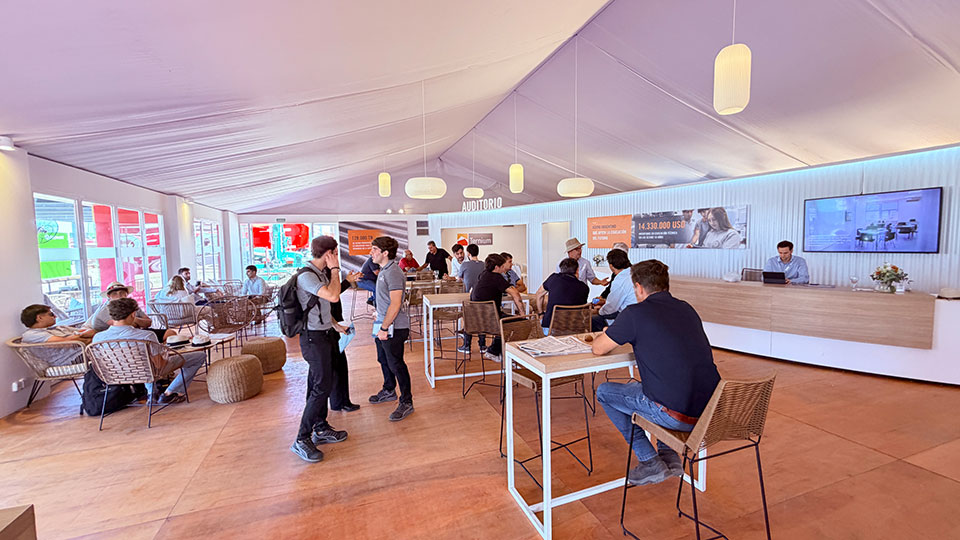 "Funcionó como punto de encuentro y distribución, desde donde se desplegaron senderos peatonales hacia áreas de exhibición de vehículos y maquinaria. El diseño integró elementos naturales y tecnológicos, como decks de madera y áreas verdes, para crear un ambiente cálido y contemporáneo”, destacaron desde Studio Quadra.