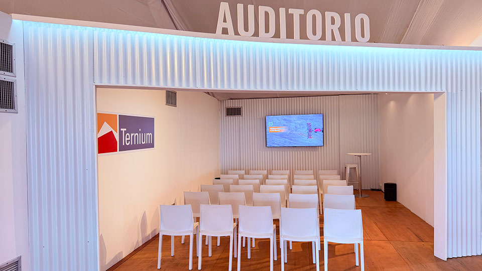 La identidad de la firma se materializó en una serie de detalles arquitectónicos realizados con productos Ternium. El elemento distintivo fue una curva de chapa blanca que organizó los espacios en el interior del stand y funcionó como eje visual de la propuesta. Este pabellón albergó múltiples actividades, entre ellas el cóctel de apertura de la firma para 200 personas y la entrega de los Premios Ternium a la Innovación Agroindustrial.