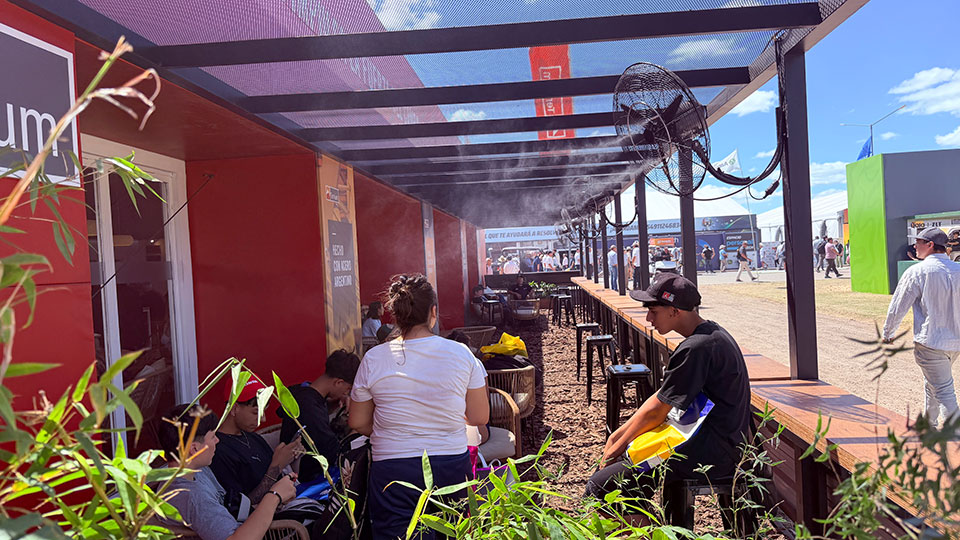 Como parte de la experiencia, el acceso al stand incorporó un pórtico pulverizador que generaba una bruma de agua de manera intermitente. Este recurso no solo aportó confort térmico en los días de calor intenso —característicos de San Nicolás en marzo—, sino que vinculó de forma directa y sensorial el producto con su aplicación en campo.