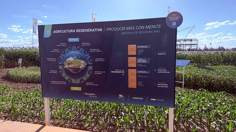 El recorrido interno fue uno de los puntos fuertes del diseño. “Eso funciona siempre. Y también es una especie de confitería”, explicó Guatelli. “Una vez que uno ingresa por el centro del stand, al final empieza con el recorrido de todos los productos de Bayer: híbridos, cultivo de servicio, trigo, soja, maíz”.